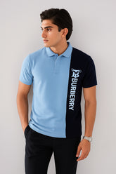 BURBARY PANEL Men’s Branded Cotton PQ Shirt in Sky-Navy Blue