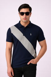 POLOO CROSS PANEL Men’s Branded Cotton PQ Shirt in Navy Blue-Light Grey