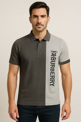 BURBARY PANEL Men’s Branded Cotton PQ Shirt in Charcoal-Grey
